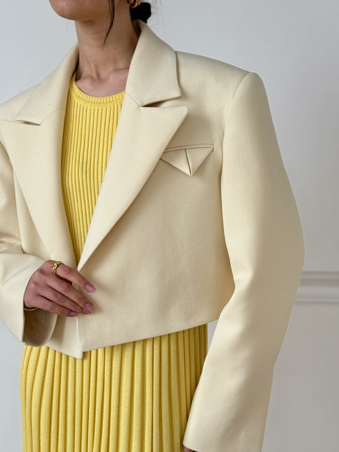 Цей стильний кроп-жакет стане центральним елементом вашого гардеробу, виконаний з якісної тканини, що дарує відчуття комфорту та бездоганного вигляду.