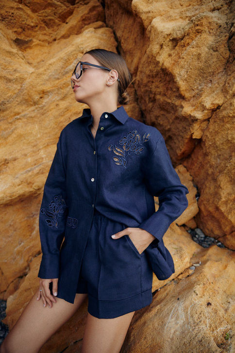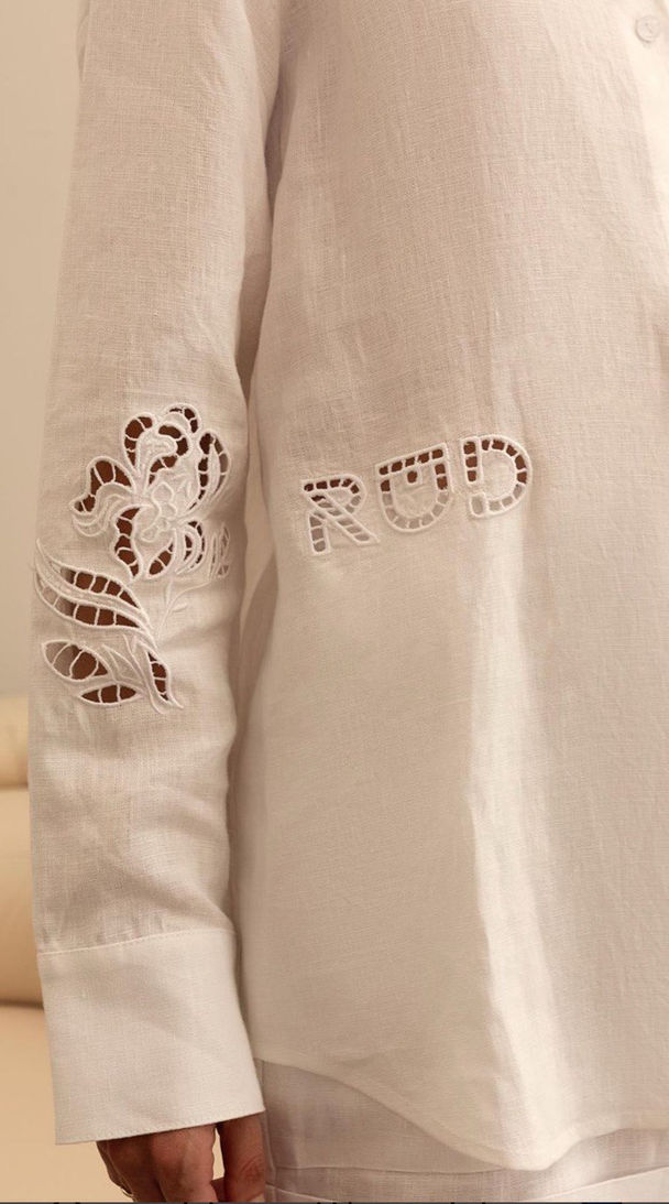 Оверсайз сорочка вільного крою, прикрашена унікальною ручною вишивкою рішельє, створює елегантний та невимушений силует.